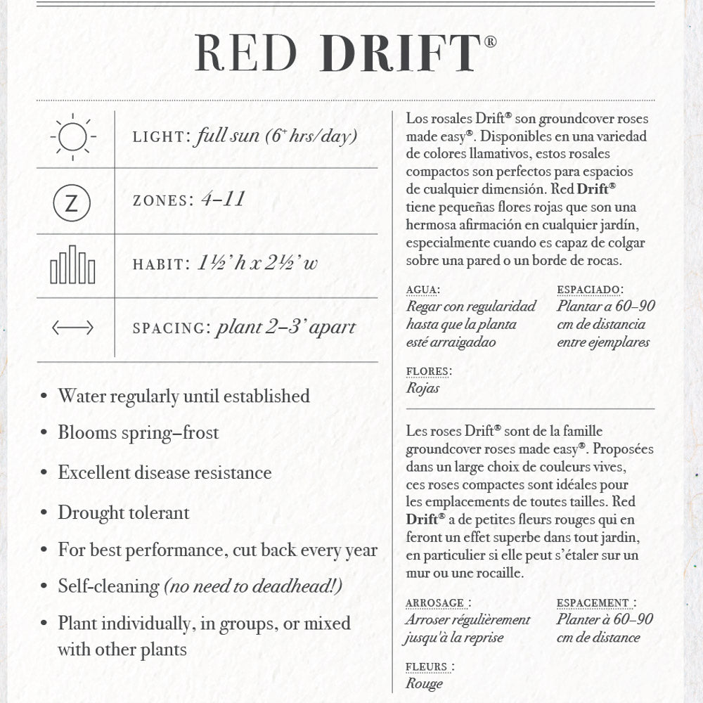 The Red Drift Rose is a variety of groundcover rose known for its profusion of small, vibrant red flowers and its compact, spreading growth habit. Here are some key features of the Red Drift Rose: